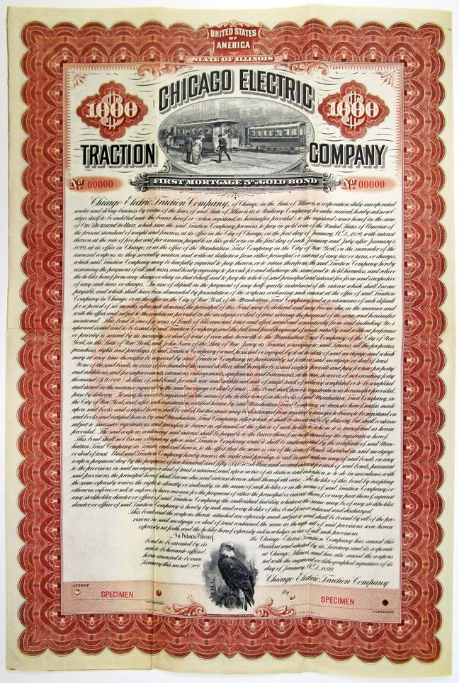 Illinois, 1899. $1000 Specimen 5% First Mortgage Gold Coupon Bond, Black text with brown border and undertint, Streetcars passing at top center. Red specimen overprints, 00000 serial numbers, and POCs. Fine condition, ABNC. This is the only example found in the ABN archives. Listed railroad but no examples photographed until this one.