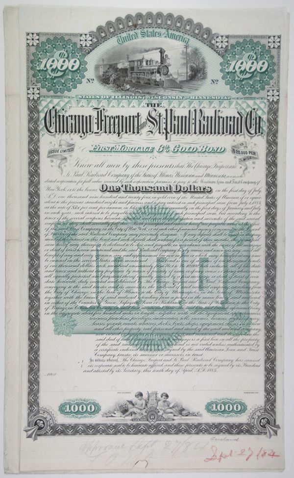 Wisconsin. Minnesota. Illinois, Specimen 1884, $1000. 1st Mortgage 6% Gold coupon bond, Proof printed on india paper mounted on thin white card, Green border and undertint, locomotive L-R passing telephone poles,. POC's, Amazing and attractive design. Includes proof coupons, back and additional correspondence, ABNC. 1 of only 2 proof bonds reported, no issued or specimen examples have been seen.