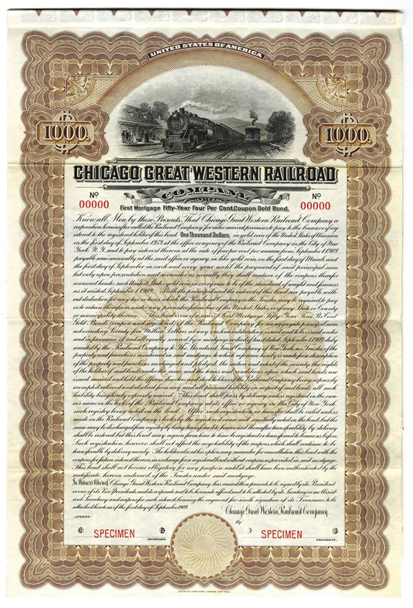 Illinois. $1000 Specimen 4% 1st Mortgage Gold Coupon Bond, Black print on brown border and under tint, Locomotives passing station at top, Specimen overprints and POC's, Fine-VF condition, ABNC.