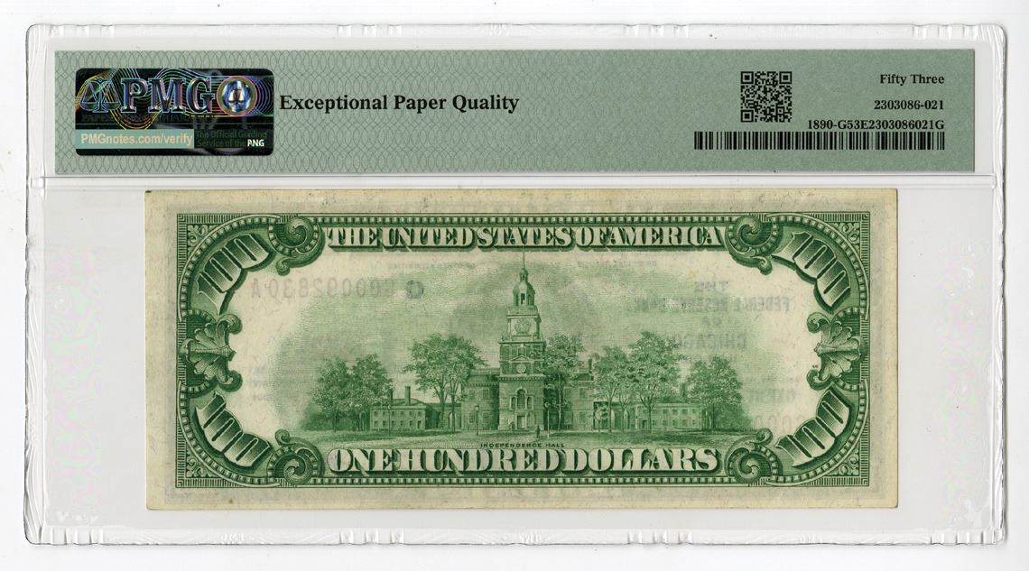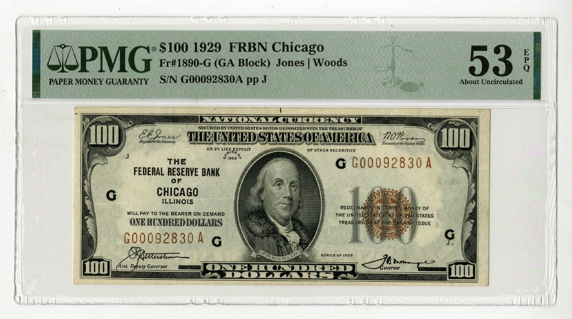 Chicago, Illinois, 1929. $100, P-399 Fr#1890-G (GA Block), Issued Banknote, Black and brown print with Benjamin Franklin at center, Back is green with Independence Hall at center, Brown seal at right, S/N G00092830A pp J, Signed by Jones | Woods, PMG graded About Uncirculated 53 EPQ.