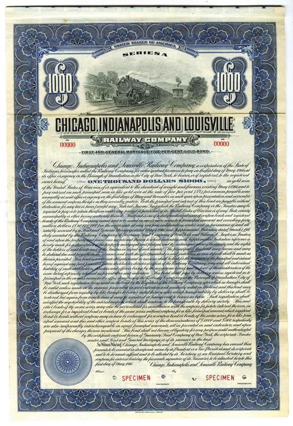 Indiana. $1000 Specimen 5% Series A 1st and General Mortgage Gold Coupon Bond, Black print on blue border and under tint, Locomotives passing station at top, Specimen overprints and POC's, Fine-VF condition, ABNC.