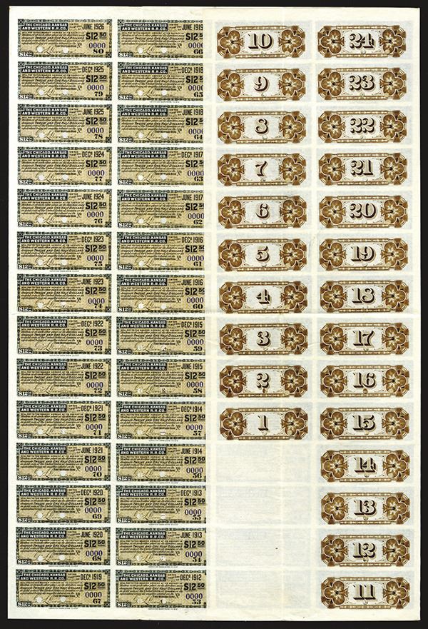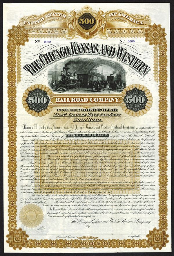 Kansas, $500 1st Mortgage 5% Gold Coupon Bond, Specimen, Black on nutmeg-brown border and underprint, Locomotive at station terminal under curved title, POC's, "0000" serial numbers, extremely attractive and rare bond. ABNC.