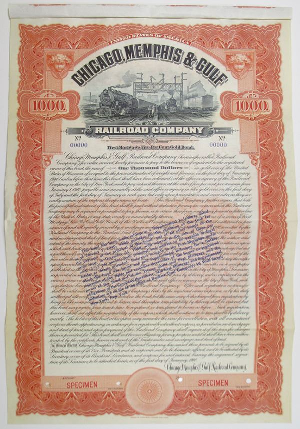 Illinois, 1910. $1000 Specimen 5% First Mortgage Gold Coupon Bond, Black text with copper border and undertint, Pair of trains approaching with men at work between at top center. Red specimen overprints, 00000 serial numbers, and POCs. VF condition, ABNC. Only known as a specimen in Cox.