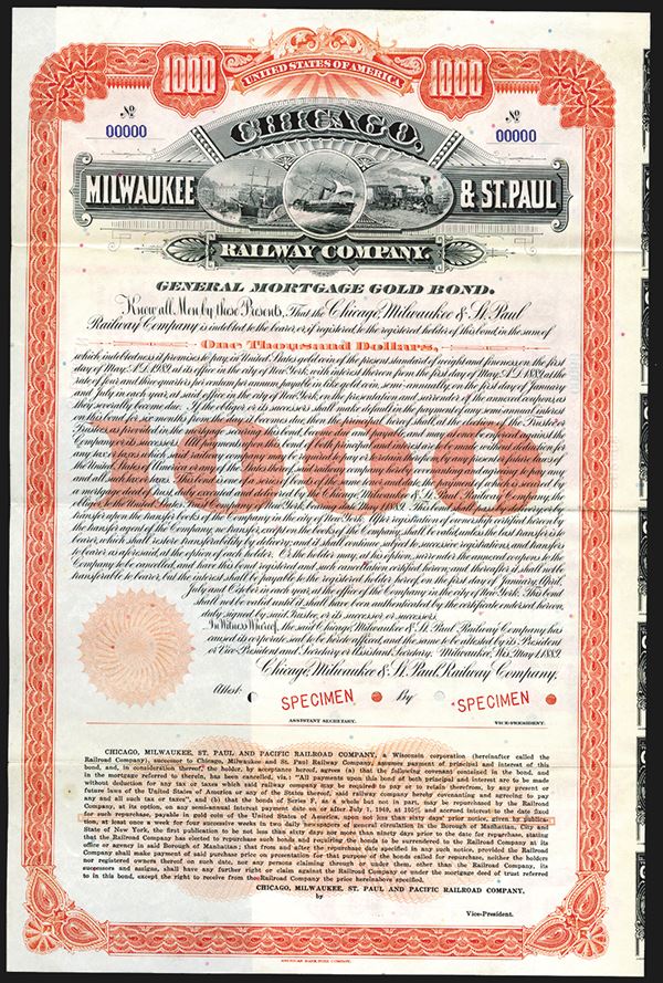 Milwaukee, WI. $1000, Specimen 4 3/4% Gold Coupon bond. Orange-red border. Steamship flanked by locomotive and ship at dock, Red specimen overprint and POC. Coupons attached. The bottom has additional text "Chicago, Milwaukee, St.Paul and Pacific Railroad Co., Successors to.....", XF condition, ABNC. Unlisted bond percentage and variety in Cox.