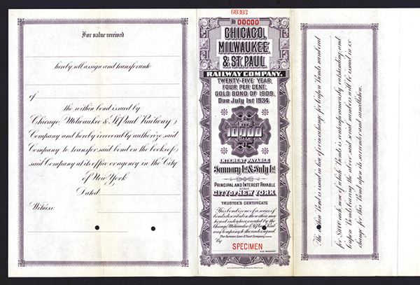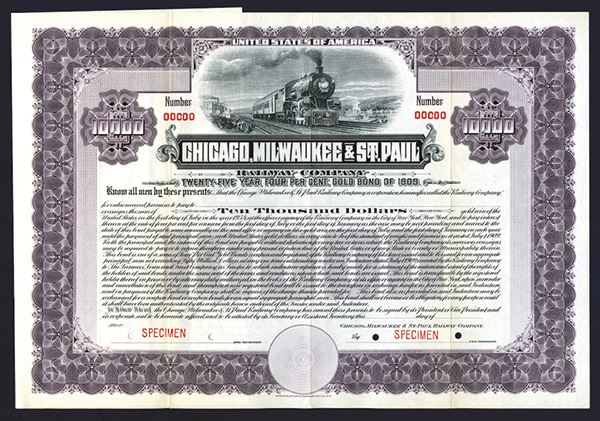 Wisconsin, 1909 Specimen $10,000 Specimen 4% Registered Gold Coupon Bond, Purple with Locomotive approaching workers on the tracks, VF, international BNC. Unlisted in Cox.