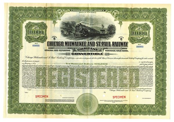 Wisconsin. $10000 Specimen 5% Series B, General and Refunding Mortgage Registered Gold Bond, Black print on green border and under tint in horizontal format, Image of locomotives at top, Specimen overprints and POC's, VF-XF condition, ABNC.