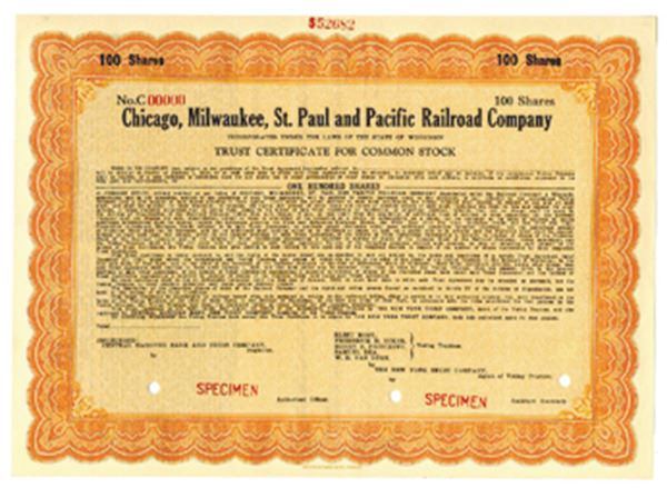 Wisconsin. 100 Shares Common Stock Specimen Certificate, Black print on orange border and under tint, Company title at top, Specimen overprints and POC's, VF-XF condition, ABNC.