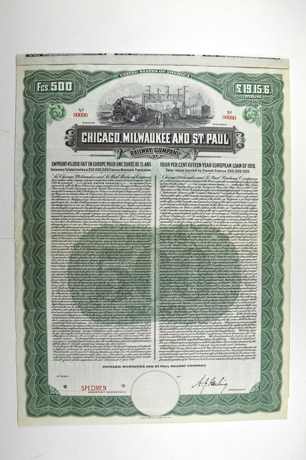 Illinois & Wisconsin. 500 Francs or 19.15.6 Pounds Sterling Specimen 4% Fifteen Year European Coupon Bond, Black print on green border and under tint printed in English and French, Men congregating under signal tower at railyard with locomotives approaching, Specimen overprint and POC's, VF-XF condition, ABNC.