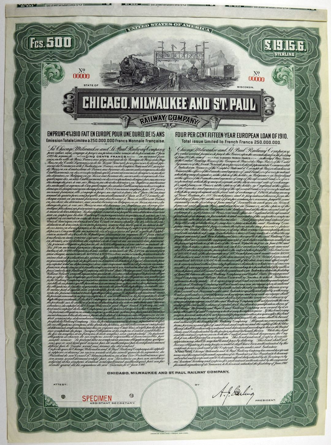 Illinois & Wisconsin. 500 Francs or 19.15.6 Pounds Sterling Specimen 4% Fifteen Year European Coupon Bond, Black print on green border and under tint printed in English and French, Men congregating under signal tower at railyard with locomotives approaching, Specimen overprint and POC's, VF-XF condition, ABNC.