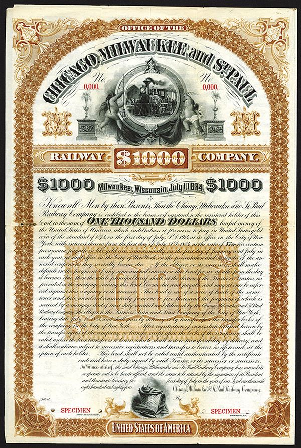 Milwaukee, Wisconsin. 1884, $1000 Specimen bond. Black on brown border and undertint, Locomotive at station flanked by cherubs, Coupons attached. VF condition. Red specimen overprint and POC's. ABNC. Only 2 found in archives. Rare and attractive railroad bond and this is the only one available. Unlisted design, color and bond date in Cox.
