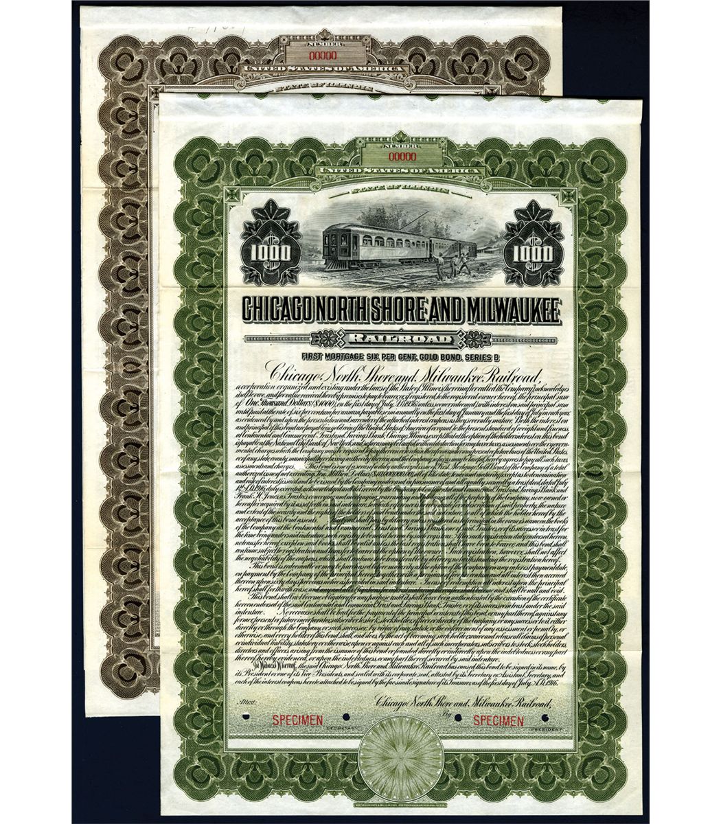 Illinois. 1916. Lot of 2 bonds, includes $500, Series A, brown and $1,000, Series B, olive green 1st Mortgage 6% Gold Coupon Bond Specimens, electric train passing workers, POC's. ABNC. Unlisted bond denominations in Cox, only the $100 listed. Attractive and rare.