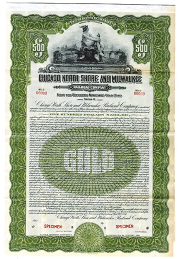 Illinois. $500 Specimen 5 1/2% Series B 1st and Refunding Mortgage Gold Bond, Black print on green border and under tint, Mercury sitting on engine by locomotives at top, Specimen overprints and POC's, VF-XF condition, ABNC.