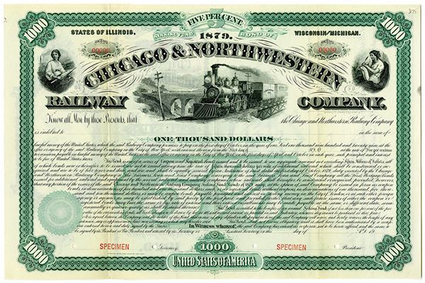 IL, WI & MI, ND (1900s). $1000 Specimen 5% Registered Sinking Fund Bond, Black text with green border and undertint, Train passing over bridge at top center with allegorical woman at both top corners. Red specimen overprints, 00000 serial numbers, POCs. Fine condition, ABNC.