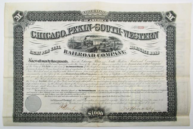 Illinois, 1876. $1000 I/U 8% Mortgage Coupon Bond, Black text with black border, Train passing through fields with farmers at work at top center. VF condition, especially for its age, Western BN.