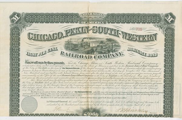 Illinois, $1000 8% Mortgage Coupon Bond. Black printing, locomotive passing farmers harvesting crops with harbor scene in background, S/N 715, Coupons attached, VG condition with archivally repaired internal splitting at folds. Western BNC.