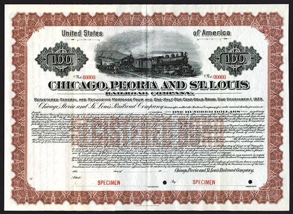 Illinois. 1913. $100 Registered General and Refunding Mortgage 4 1/2% Gold Bond Specimen, brown border and undertint, two locomotives L-R. POC's. XF. ABNC. Possibly an unlisted date in Cox. Attractive and rare.