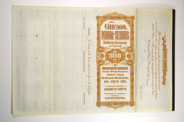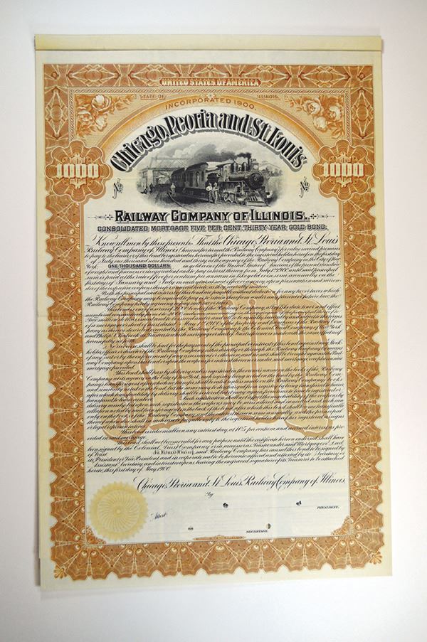 Illinois. Specimen $1000 Consolidate Mortgage 5% Gold Coupon Bond, Black on light brown border and underprint, train with workers standing by it, VF-XF, FBNC. Very attractive and scarce bond with not more than 3 or 4 in existence.
