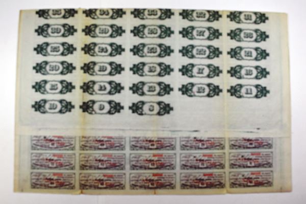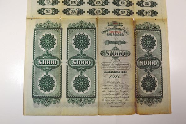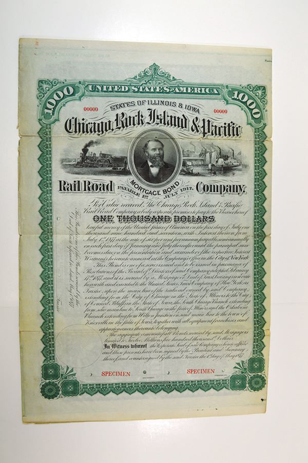 Iowa and Illinois, $1000, 6% Mortgage Gold Coupon Bond, Black vignette and text with green border, Portrait of railroad notable flanked by locomotive and harbor scene, Specimen overprints, POC's, ABNC. Listed railroad in Cox but previously unlisted bond variety and color. Unique in archive and possibly the only example available. This is the example mentioned in Cox.