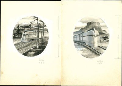 DE, IL. 1948. All were printed and designed by E.R. Grove and dated 1948. Grove also designed U.S. Postage stamps. The lot incldues 4 different original oval shaped paintings between 4 inches and 5 inches in diameter. The 2 smaller ones are completely hand painted while the 2 larger ones have real photos of the trains with the background painted and the trains touched up with paint. Also included is a sheet of 4 vignettes with allegorical figures that was evidently rejected as well as a single proof vignette and photographs of a "Rock Island" Diesel. Unique in archive. SBNC. Choice group.