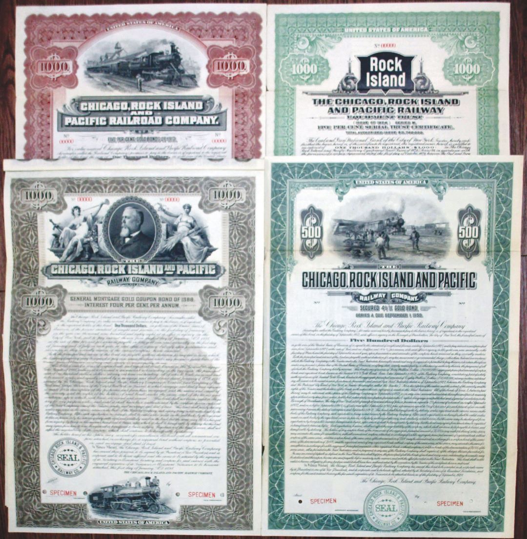 Illinois. Lot includes 4 pieces: 1903, Chicago, Rock Island & Pacific Railroad Co. $1000 Specimen 5% Gold Coupon Bond in purple; 1924, Chicago, Rock Island & Pacific Railway Equipment Trust $1000 Specimen 5% Serial Trust Coupon Bond in green; 1898, Chicago, Rock Island & Pacific Railway Co. $1000 Specimen 4% General Mortgage Gold Coupon Bond in brown; 1927, $500 Specimen 4.5% Secured Gold Coupon Bond in green. The Equipment Trust is an unlisted color and the 1927,500 bond is an unlisted color and denomination in Cox. All are rare.