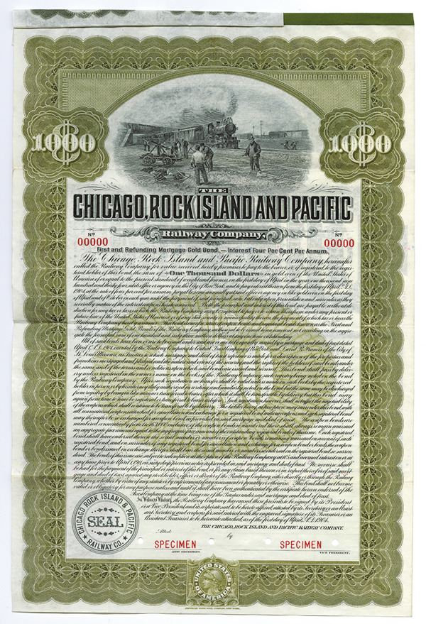 Iowa. $1000 Specimen 4% 1st and Refunding Mortgage Gold Coupon Bond, Black print on olive green border and under tint, Men repairing tracks with locomotive in background, Specimen overprints and POC's, VF-XF condition, ABNC.