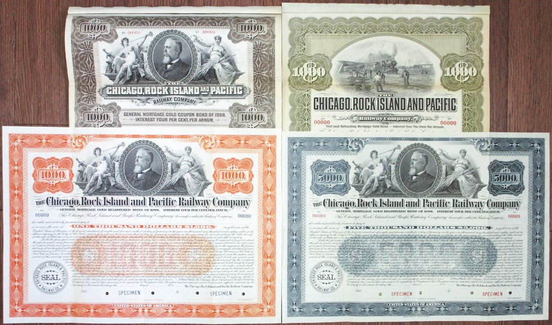 Iowa & Illinois. Lot of 4 pieces, Includes: 1898 $5000 Specimen 4% Registered General Mortgage Gold Bond in blue; 1898 $1000 Specimen 4% Registered General Mortgage Gold Bond in orange; 1898 $1000 Specimen 4% General Mortgage Gold Coupon Bond in brown; 1904 $1000 Specimen 4% First and Refunding Mortgage Gold Coupon Bond in olive. All have specimen overprints, 00000 serial numbers, POCs, are in VF condition and printed by ABNC. (4)