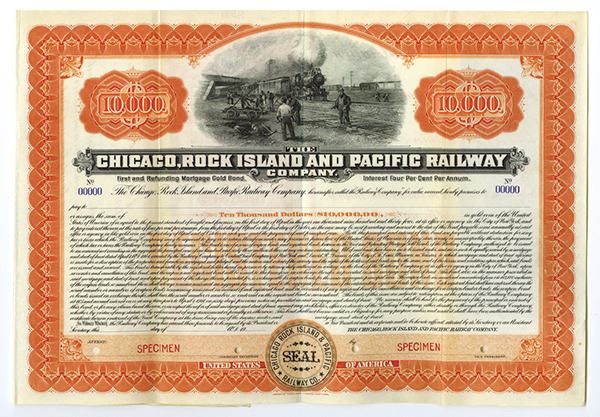 Iowa. $10,000 Specimen 4% Registered 1st and Refunding Mortgage Gold Bond, Black print on orange border and under tint on horizontal format, Men repairing tracks with locomotive in background, Specimen overprints and POC's, VF-XF condition, ABNC. Listed bond on Cox, unlisted color type.