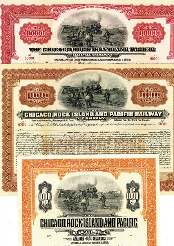Iowa and Illinois. Lot of 3 Specimen Bonds 1) $1000 Series A 4 1/2% Secured Gold Coupon Bond, Black print on orange border and under tint, Image of men repairing and working on tracks with a locomotive coming up behind them, 2) $10000 Series A 4 1/2% Registered Secured Gold Bond, Black print on ornate red/pink border and under tint, Image of men repairing and working on tracks with a locomotive coming up behind them, 3) )$1000000 4% 1st and Refunding Registered Mortgage Gold Bond, Black print on brown border and under tint, Image of men repairing and working on tracks with a locomotive coming up behind them. All have Specimen overprints, POC's, and are Fine-VF condition. Listed Railroad on Cox, however, Some of these Types are Unlisted.