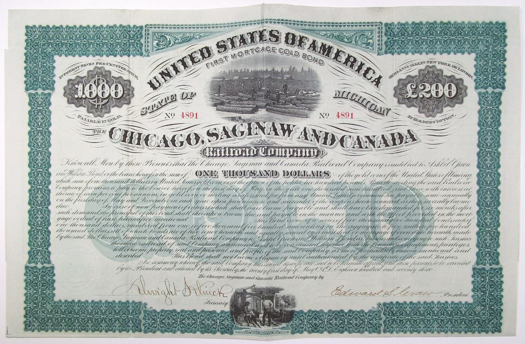 Michigan, 1873. $1000 I/U 7% First Mortgage Gold Coupon Bond, Black text with green border and underprint, Men standing among logs at top center. Fine condition, NBN.