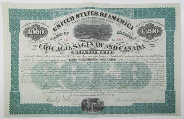 Michigan, 1873. $1000 I/U 7% First Mortgage Gold Coupon Bond, Black text with green border and underprint, Loggers at work at top center. Fine-VF condition, NBN.