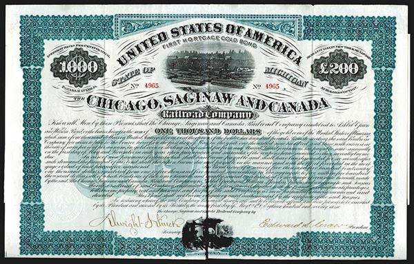 Michigan, 1873, $1000, 1st Mortgage 7% Issued Bond, #4693, Horizontal format, Coupons attached, Black on green border and underprint, Lumberjacks standing on logs in river top center, VF condition, NBNC. These bonds sold up to $40,000 each during the 1990's Gold Bond Craze.