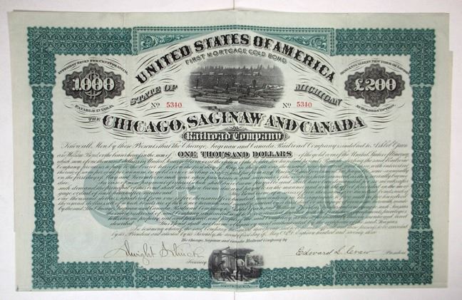 Michigan, 1873. $1000 I/U 7% 1st Mortgage Gold Coupon Bond, Black print on green border and under tint in horizontal format on large sized certificate, Image of men logging at top and cutting down timber at the bottom, VF-XF condition, NBNC.