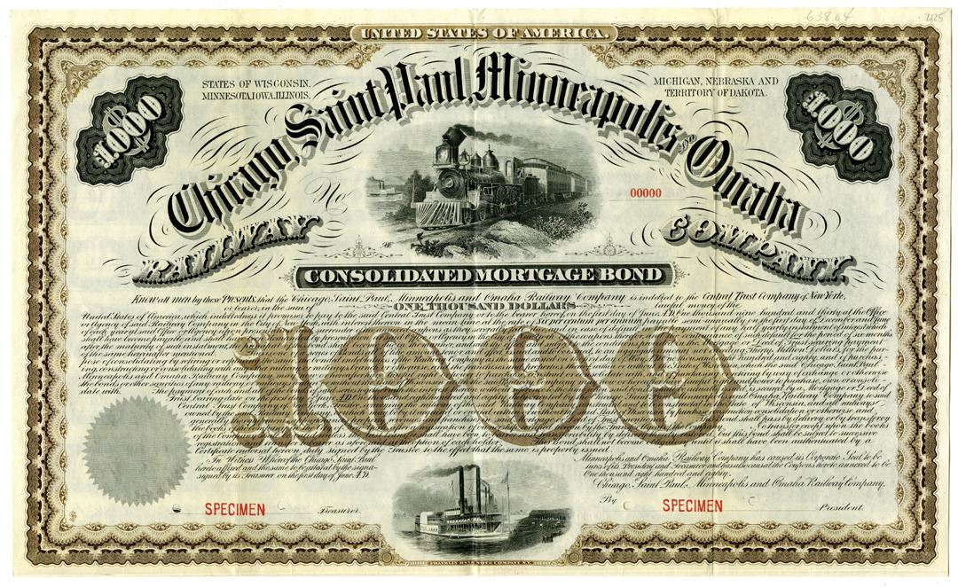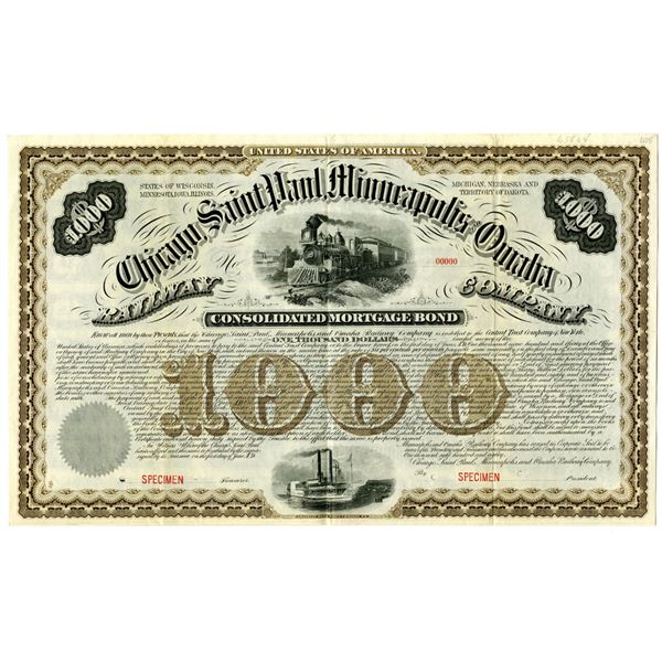 1880. $1000 Specimen 6% Consolidated Mortgage Coupon Bond, Black text with brown border and underprint, Train passing on tracks at top center. Red specimen overprints, 00000 serial numbers, and POCs. Fine-VF condition, FBN. Only listed as a specimen in Cox.