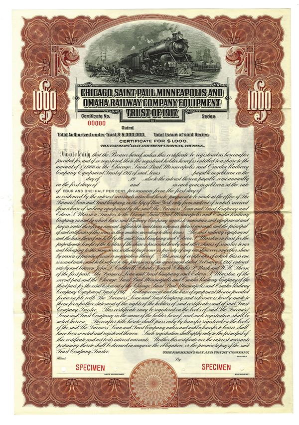 Illinois. $1000 Specimen 4 1/2% Coupon Bond, Black print on large brown border and under tint, Image of locomotive and men working on the track, Specimen overprints, POC's, VF-XF condition, ABNC.