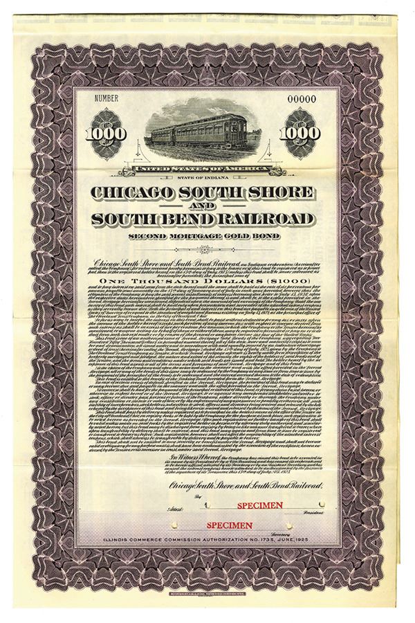Indiana. $1000 Specimen 6% 2nd Mortgage Gold Coupon Bond, Black print on large purple border and under tint, Image of railcars at top, Specimen overprints, POC's, VF-XF condition, WBNC. Listed Railroad, Unlisted Bond on Cox.