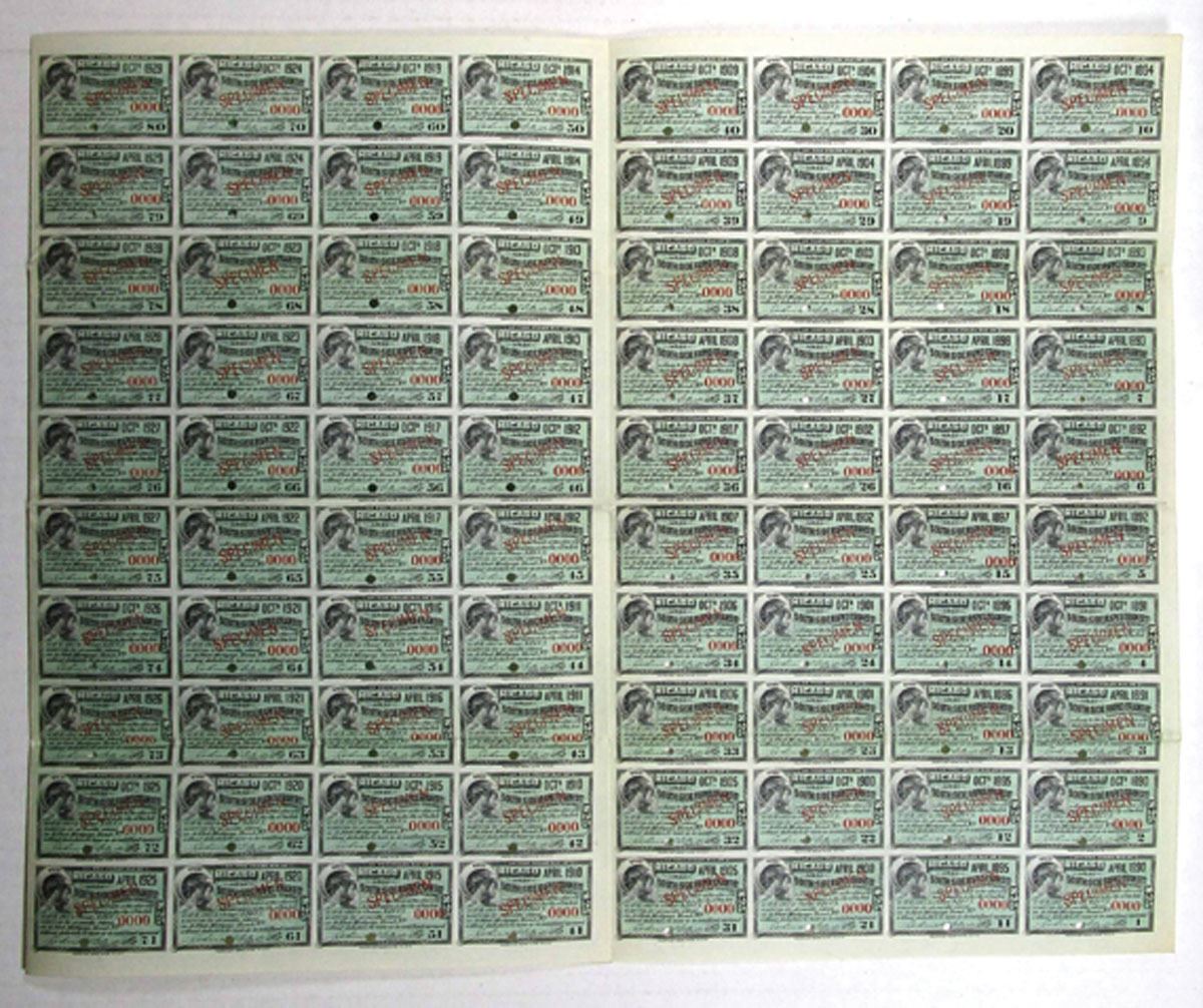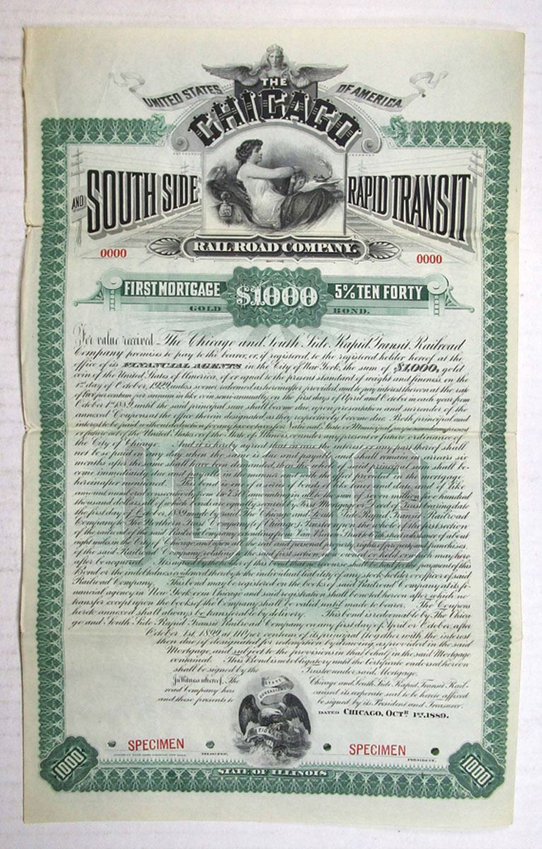 Illinois, 1899. $1000 Specimen 5% First Mortgage Gold Coupon Bond, Black printing with green border and underprint, Allegorical woman reclining at top, Specimen overprints and POCs, VF-XF. ABNC. Only 2 examples found in the ABN Archives in 2002, no others available.