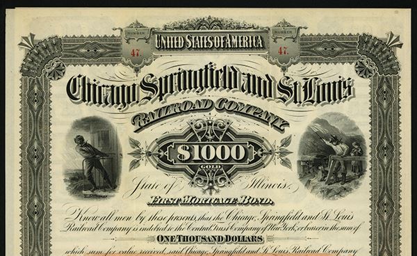 Illinois,1883, $1,000. Issued and uncancelled, 6% first mortgage gold bond. Black border with brakeman on left, man waving at train on right and train at station on bottom. ABNCo with coupons. VF, Scarce and attractive bond.