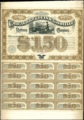 IL, TN, MO. 1885. Proof. $150 Coupon Bond, Brown. Steam locomotive at station and small eagle at bottom. Attached coupon on bottom of bond. Printed on india on light manila card. Unlisted railroad in Cox. Top states "50 of these certiificates are issued upon each mile of the company's railway". Purple "specimen" overprint. Rare, ornate and attractive bond. HBNC. XF.