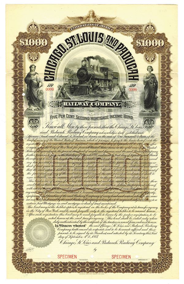 Illinois. $1000 Specimen 5% 2nd Mortgage Income Bond, Black print on ornate brown border and under tint, Locomotive at top head on flanked by standing allegorical women, Specimen overprints and POC's, Fine-VF condition with splitting along fold lines, ABNC. Rare and attractive bond. There were only 2 copies of this lovely bond found in the ABN archives in 2002 and this is the only example available. It is also the photographed example in Cox as the Cox plate note.