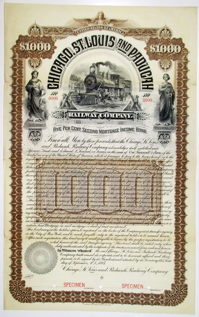 Illinois, 1887. $1000 Specimen 5% Second Mortgage Income Bond, Black text with brown border and undertint, Man standing by train at top center. Red specimen overprints, 0000 serial numbers, and POCs. Fine-VF condition with minor splitting along fold lines, ABNC. Only 2 examples found in the ABN Archives in 2002 and only known as a specimen in Cox.