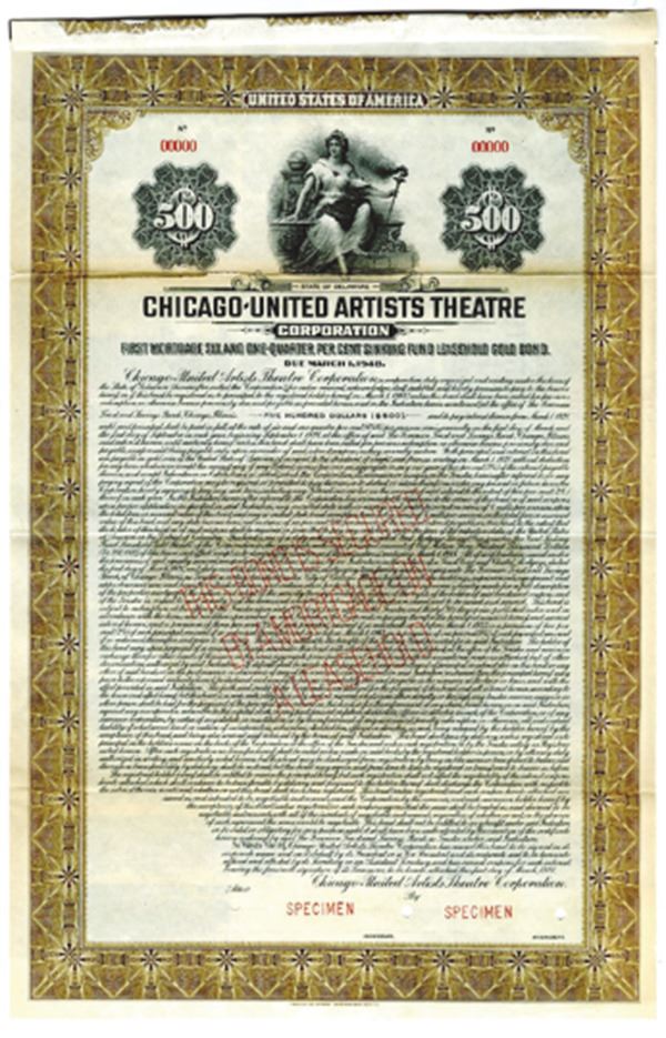 Delaware. $500 Specimen 6 1/4% 1st Mortgage Sinking Fund Leasehold Gold Coupon Bond, Black print on brown border and under tint, Allegorical woman at top, Specimen overprints and POC's, Fine condition with splitting and toning along fold lines condition, ABNC.