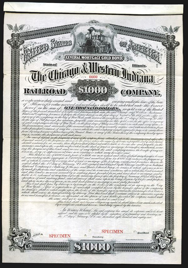 Illinois and Indiana, $1000, Specimen bond, Train at station, Black on white with no underprint, POC's, VF. ABNC, only known as a specimen.