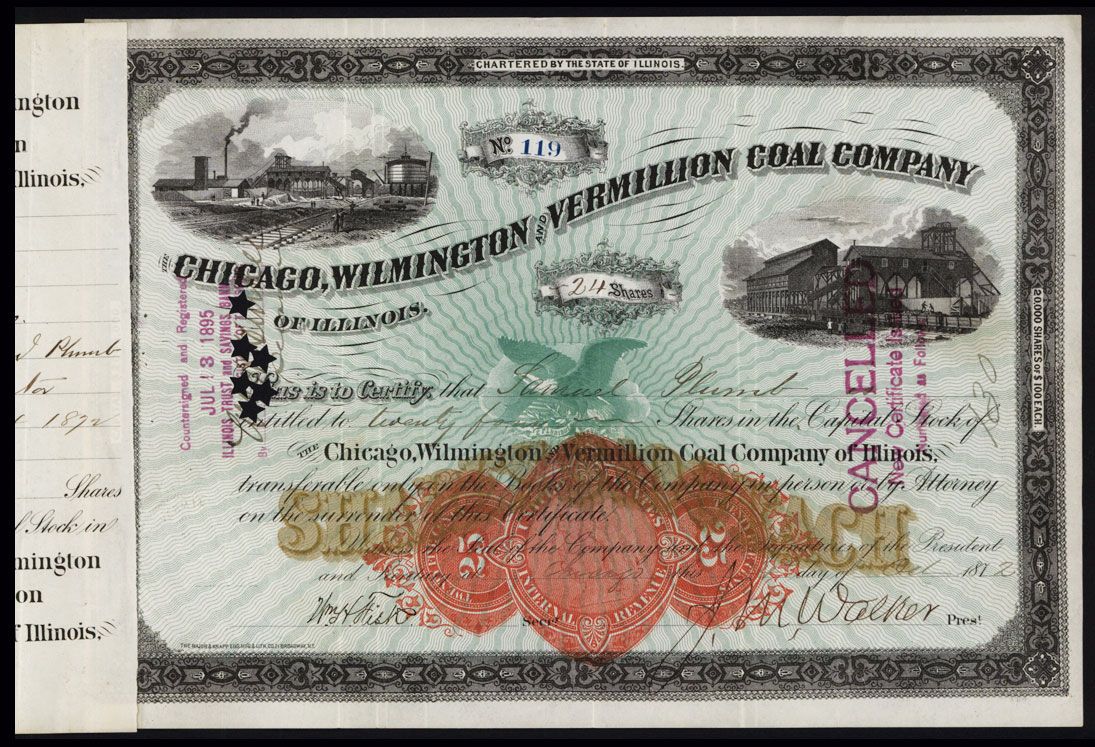 Chicago, Illinois, 24th October, 1872, 24 Shs, Issued and ink and punch cancelled, Black on light green and gold underprint with Imprinted Revenue RN-U1 but with Red color on stamp, not orange color as issued, Vignettes include eagle in middle, men by tracks and factory on upper left and coal cars at mine on upper right, Counterfoil is attached to left side, Cert.# 119, XF condition, Major Knapp, Printer, Rare and very attractive revenue imprinted stock certificate.