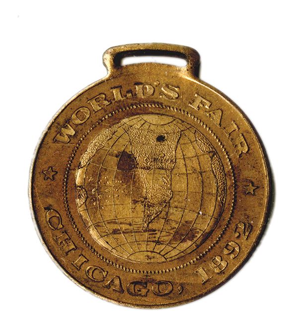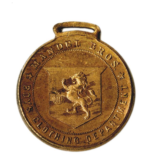 Globe, Mandel Bros. Clothing Dept. Lion rampant in shield. 31mm brass.
