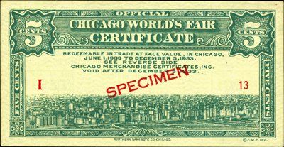 Chicago, IL. 1933. 1 cent; 5 cents; 25 cents 3 different Chicago World's Fair specimen "Official" certificates. Red specimen overprints and POC's. Face has Chicago skyline and back has World's Fair view. Printed by Northern BNC in Chicago, Illinois. From their archives. Unique specimen set in choice Unc. condition. Northern BNC.