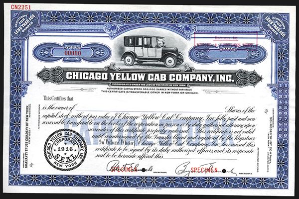 Illinois. <100 Shares, Specimen Black on blue border, early yellow cab vignette, XF condition. Popular and rare automobile related certificate.