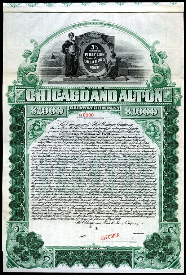 Chicago and Alton Railway Co., 1900, $1000 Specimen 3 1/2% Gold Coupon Bond. Illinois, 1900, $1000 Specimen 3 1/2%, 50 Year Bond , Standing allegorical woman and seated man flanking the terms of the bond in oval top center, POC's, VF-XF condition, IBNC. Listed railroad in Cox but unlisted as a specimen bond variety.