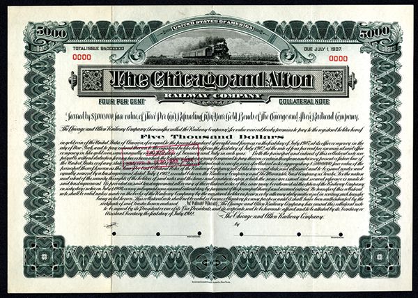 Chicago and Alton Railway Co., 1902, $5000 Specimen Bond. Illinois, 1902, $5000, 4% 5 Year Collateral Specimen Bond, Moving locomotive top center, POC's, VF condition, IBNC. Only known as a specimen in Cox.