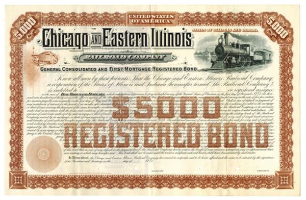 Illinois & Indiana. $5,000 Specimen 5% Registered General Consolidated and 1st Mortgage Bond, Black print on red/brown border and under tint in horizontal format, small image of locomotive at top right corner, Specimen overprints and POC's, VF-XF condition, FBNC.