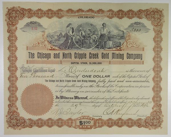 Colorado, 1896. 5,000 Shares I/U Capital Stock Certificate #132, Black text with brown border, Men at work in mine flanked by allegorical figures. Fine-VF condition.